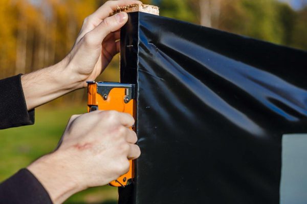 Następnie, mocujemy folię do łat za pomocą zszywacza tapicerskiego lub pinezek.